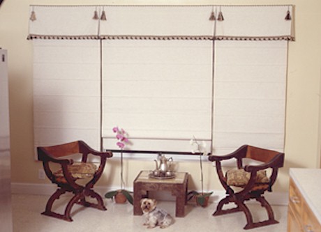 Picture Description Flat Roman Shade with Box Pleat Valance with trim applied